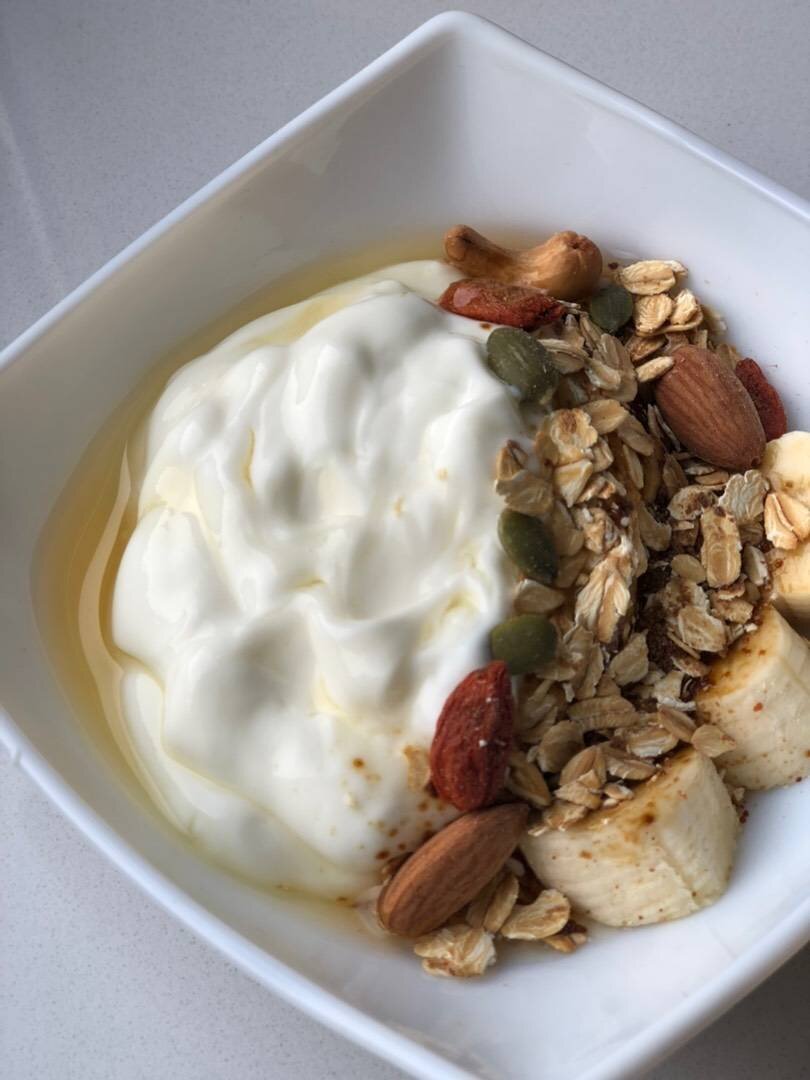 Очень вкусный и сытный завтрак, совсем не давно опубликовала фото отзыв и свой вариант приготовления домашней гранолы. Хочу показать вариант завтрака с ней. Фрукты и ягоды могут быть любые, по сезону и желанию. #завтрак #готовимвместе Ингредиенты: натурального йогурт, гранолы, банан, ст.л сиропа топинамбура Способ приготовления: На дно пиалы выкладываем нарезанный банан. Сверху насыпаем гранолу. Затем натуральный йогурт. Посыпаем ещё гранолой (она у меня с орехами, тыквенными семечками и сухофруктами) и поливаем сиропом топинамбура. Завтрак готов. Приятного аппетита!