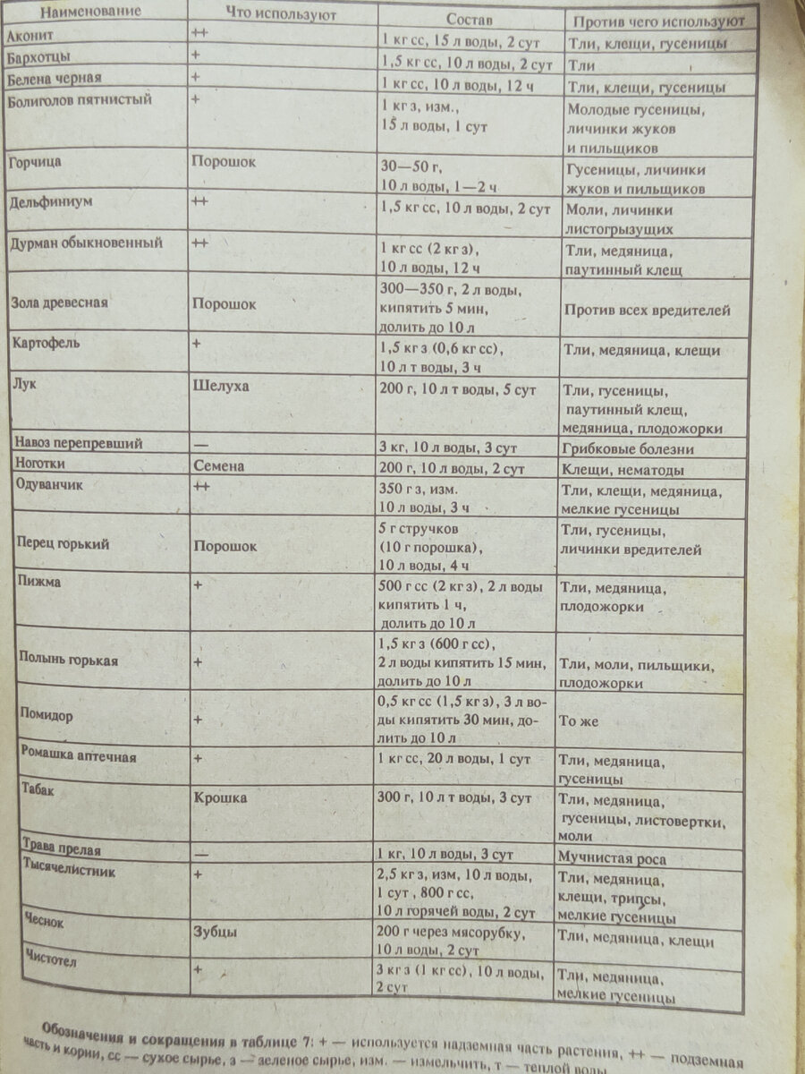 У каждого начинающего садовода возникал вопрос: а как наши предки в борьбе с вредителями и болезнями сада обходились без современных средств? Ведь и в прошлом этих вредителей и болезней было не меньше, чем сейчас. Они пользовались растительными и некоторыми другими средствами. В таблице 7 приведены некоторые из них. Надо сразу же отметить, что, по мнению автора, зольный настой должен стать основным средством борьбы с вредителями и болезнями сада. Он имеет широкий диапазон действия, кроме того, как подмечено учеными, зольный настой стерилизует (лишает потомства) многие виды вредителей. Настой золы хорошо сочетается с химическими препаратами и растительными настоями и является прекрасной некорневой подкормкой. Предупреждение. Такие травы, как аконит, белена, болиголов пятнистый, дурман’ обыкновенный, ядовиты для человека. Пользоваться ими надо, соблюдая все меры предосторожности. При всех видах опрыскивания (народных, химическими веществами) в ведро раствора или настоя добавляют 15—