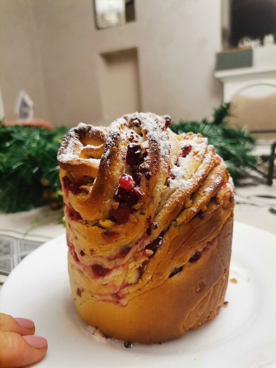 Ингредиенты: Для опары: Для замеса теста: Вариант начинки (вместо клюквы): Способ приготовления: Сначала готовим опару. В теплое молоко добавляем 1 ч. л. сахара, 1 ч. л. муки и сухие дрожжи.Хорошо перемешиваем и оставляем в тепле на 10-15 минут. Берем 2 желтка и 1 яйцо, добавляем сахар, щепотку соли и взбиваем миксером, до светлой пышной пены, увеличения массы в 2 раза и полного растворения кристаллов сахара.В предварительно просеянную муку вливаем дрожжевую опару, теплое растопленное сливочное масло, сок апельсина, добавляем цедру апельсина, взбитые яйца.Замешиваем тесто.Вымешиваем тесто до тех пор, пока оно не станет эластичным и не перестанет отставать от рук, примерно 10-12 минут. Тесто скатываем в шар, выкладываем в миску, смазанную растительным маслом. Совсем немного смазываем тесто растительным маслом. Накрываем тесто пищевой пленкой и отправляем в теплое место без сквозняков на 1,5-2 часа. Подошедшее дрожжевое тесто выкладываем на стол и делим на 2-3 части.Скатываем тесто в ша