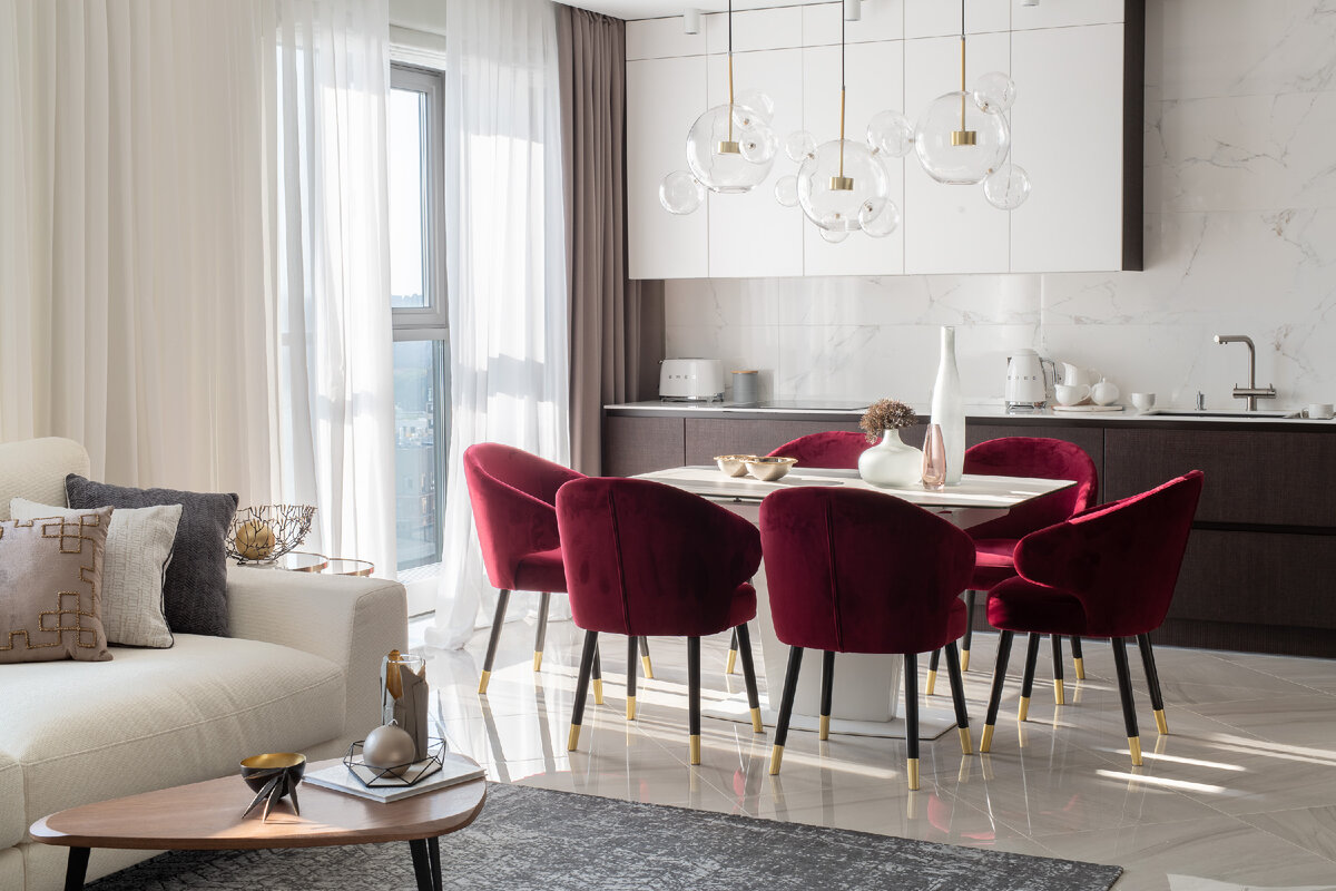 Дизайнеру Маргарите Мельниковой удалось деликатно интегрировать кухню в жилое пространство гостиной, при этом кухня получилась не только красивой, но и очень функциональной. В качестве фасадов кухни выбрали структурный шпон насыщенного шоколадного оттенка. В установленных вдоль стены колоннах расположили вместительные системы хранения, крупную бытовую технику, в том числе и кофемашину. От видимых ручек отказались. Для комфортного открывания шкафы оснастили электромеханизмами Servo-Drive, которые срабатывают от легкого прикосновения к фасадам. Чтобы пространство не выглядело загроможденным, верхний ряд шкафов разместили только на часть стены, продлили до потолка и выкрасили в белый оттенок. Зону TV в гостиной дизайнер выделила панелями из натурального шпона Дуб Vintage Grey с благородно подчеркнутым рисунком дерева. В прихожей в нише установили закрытые шкафы гардероба Manhattan, которые также намеренно «растворили» на фоне стен. Выделают их лишь вставки на ручках, выполненные в том же