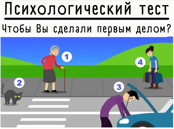 Посмотрите на картинку и выберите действие. Итак, вы: У вас высокие моральные принципы. Вы чтите традиции. Всегда боретесь с несправедливостью и помогаете тем, кто слабее вас. Вы внимательный и заботливый человек. 2. Вы решили помочь кошке Вы коммуникабельны, любите общение с разными людьми. Очень любите животных и считаете их беззащитнее людей. Иногда мир для вас предстает в розовых очках. Вам нравится так жить. 3. Вы решили помочь мужчине Вы ответственный и серьезный человек. Вы у других вызываете доверие и располагаете к себе. У вас большой круг общения и много друзей. Всегда готовы первым помочь другому в любых делах. 4. Вы решили помочь женщине Вы наслаждаетесь помощью другим. Вас это заряжает и радует. Вам нравится чувствовать себя нужным. Очень важно, чтобы вас оценили и поблагодарили. Стараетесь быть в центре внимания. #тест #быстрый тест #тест по картинке #психология #самопознание