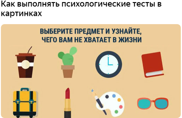 • Проходить этот психологический тест в картинках можно не чаще чем один раз в три месяца. Если вам все понятно, смело приступайте к выполнению задания. Результаты психологического теста Узнайте, на что указывает ваш выбор. 1. Стакан с кофе говорит о том, что вам давно пора отдохнуть. Вы много работаете, и часто не успеваете сделать все запланированное. Вам не хватает сил и времени на реализацию за