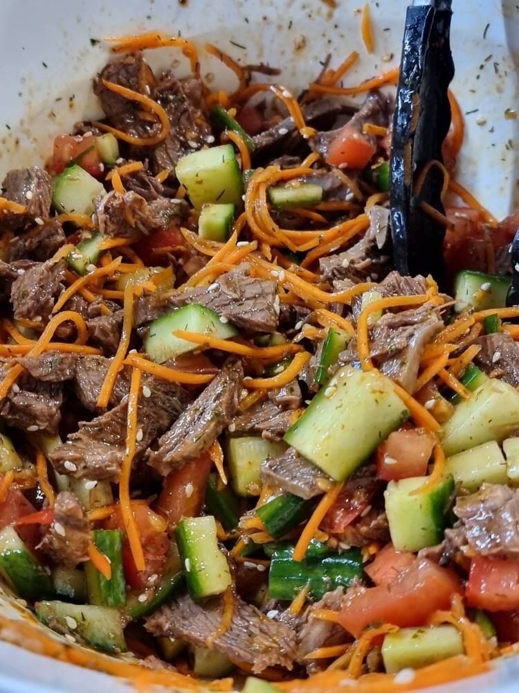 Очень вкусный салат. Ингредиенты: говядины, помидор, огурца рава, чеснока, морковь (корейская или обычная), Кунжутные семечки, Сахар, Сои, Специи (копченая паприка), Соль , луковица, Растительное масло, Укроп (сушёный или свежий) Способ приготовления: Отварить говядину и нарезать не очень мелко. Если морковь корейская, тогда шаг пропускаем. Если морковь свежая за пару часов необходимо натереть, посолить, столовую ложку уксуса и специи. Оставить минут на 20 минимум. Нарезать огурца и помидоры крупно. Смешиваем мясо + помидоры + огурцы + морковь + выдавить чеснок + сахар + соль + специи + кунжут. На сковороде масло раскалить и разрезать на две части лук и его поджарить в масле (лук выкинуть). В салат сверху на чеснок выливаем раскаленное масло. Перемешиваем, + зелень, перемешиваем. Даём постоять минут 10. Готово😁 Приятного аппетита 🤤