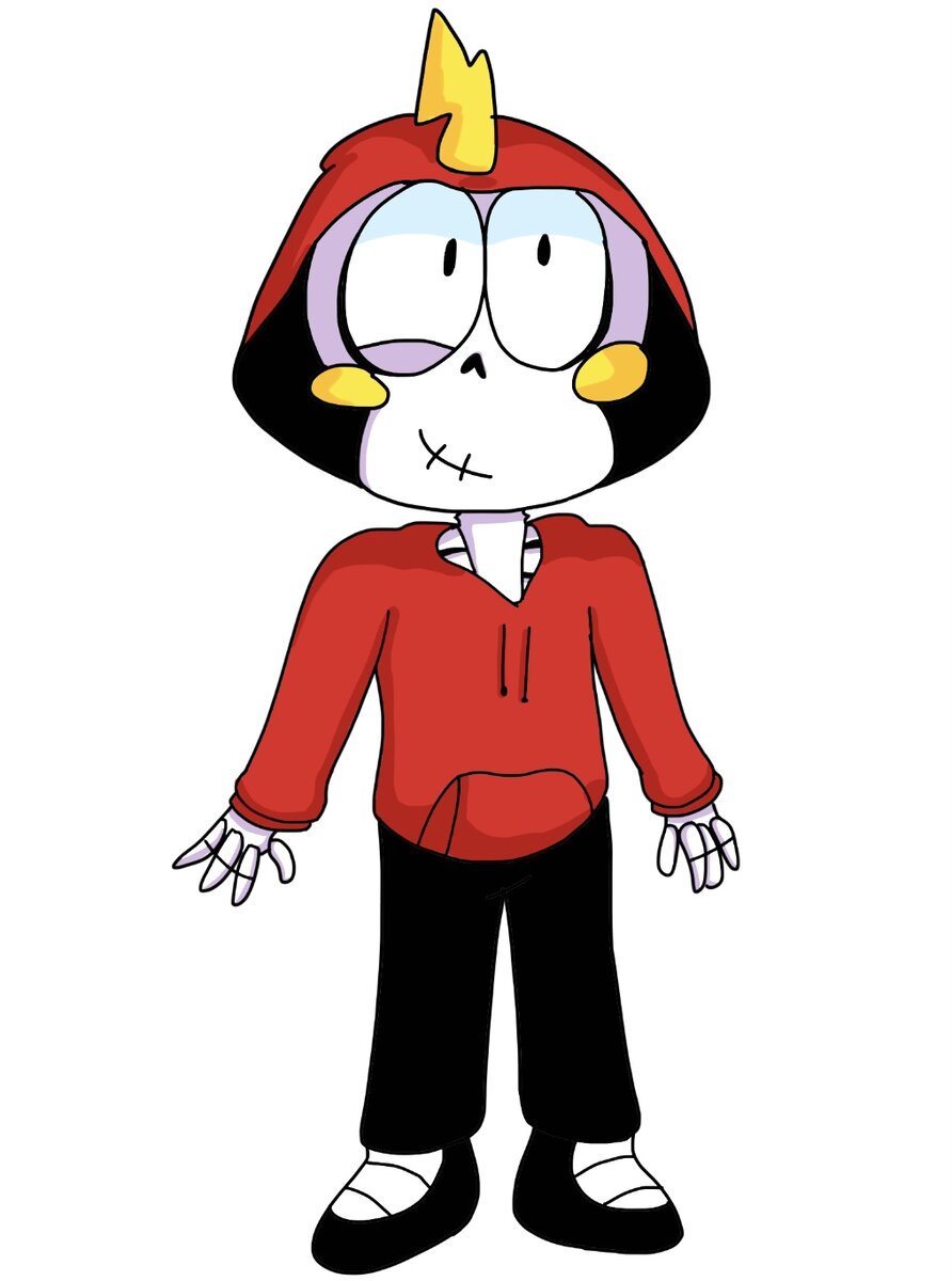 ВНЕШНОСТЬ Он выглядит как скелет подросток 13-14 лет. В основном носит красную кофту и с капюшоном с прорезом для молнии на голове (по другому называется худи), чёрные штаны и кроссовки. Цветовой окрас одежды напоминает окрас у одежды Злыдня. На лице есть парочку щёчек-светильников, меняющие цвет в зависимости от настроения. Например: если он грустный, то цвет у щёк синий, если радуется - то желтый, если злится - то ярко красные И так далее. На самом верху черепа есть одна молния. В целом лицо напоминает корабль, не ну сравните: ХАРАКТЕР И ОТНОШЕНИЯ В основном, он очень жизнерадостный, оптимистичный и любопытный, ну а если его довести до ТАКОЙ СТЕПЕНИ, то разозлится и начнет БОЙ ПРОТИВ СВОЕГО ВРАГА! Если его секреты чуть не узнают, то пытается