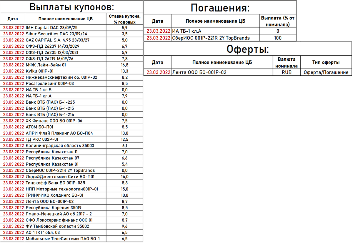Выплаты, оферты и погашения облигаций на текущей неделе: сегодня 23.03.2022 года.