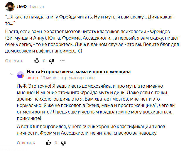 Написала я пост про фильм "Метод Фрейда". Сама написала! Свой! Свое мнение выразила. И что вы думаете? А почитайте на картинке комментарии ( или вот тут пост). Ну нравятся мне такие люди! Я про свои впечатления и ведь явно видно, что я-не спец! И тут же меня обзывают "не хватает мозгов" и "дичь"! Прелесть, правда? Так вот что я скажу: я -личность. Я имею право на то мнение, которое у меня сложилось из моих знаний и опыта. Я имею право что-то любить, а что-то нет. И формулировки мнений по Фрейду-точны. Когда читала, в голове было именно мутно, системы и стройности я не увидела, поэтому это муть. Читать про то, что все (вот вообще все!) объясняется сексуальным влечением в детстве, не привлекая других причин-это как быть неандертальцем, знающим только дубину в век, когда других инструментов множество. А во времена Фрейда психология уже имела множество инструментов изучения личности. Поэтому рассмотрение личности и ее формирования только с позиции детских сексуальных желаний и травм-это
