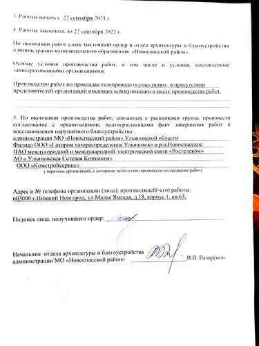 В октябре прошлого года мы рассказывали о ситуации с возобновлением строительства полигона ТКО в Новоспасском. И вот, неожиданно, на днях нам стал доступен тот самый документ, которого на момент посещения полигона активистами, не оказалось на стройплощадке, а именно ордера на производство работ. Изучив этот "документ" мы были удивлены некоторым моментам. 1. Дата выдачи ордера - 27 сентября 2021 года. Активисты были на полигоне 29 сентября, как мы уже сказали, у прораба на руках ордера на тот момент не было. Хотя от администрации до стройплощадки порядка 3 км расстояние. 2. Почему то, в ордере генеральным директором ООО СК "Строй Групп" (г. Нижний Новгород) указан Толокнов Артём Николаевич, хотя на тот момент генеральным директором данной фирмы по ЕГРЮЛ/ЕГРИП значится Ершов Андрей Николаевич, да и адрес фирмы совсем другой, а не тот, что указан в Паспорте объекта. Более того, именно с Ершовым активисты тогда разговаривали по телефону, т.е. на 29 сентября он и был генеральны
