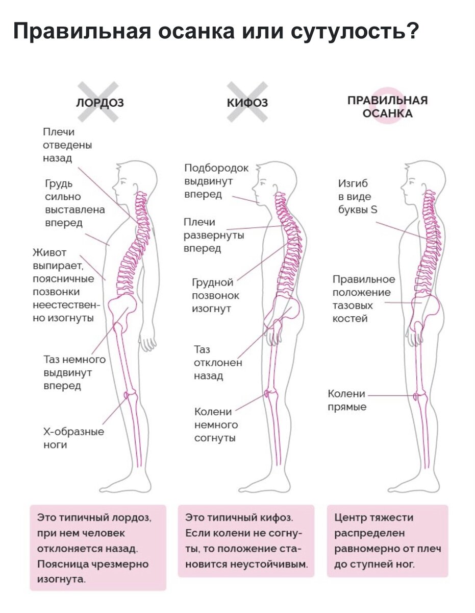 Для начала разберемся, что вообще означает слово «осанка». Этим понятием принято обозначать привычную, непринужденную манеру держать собственное тело. А правильная осанка – это поддержание изгибов позвоночника, созданных природой. Человек – существо прямоходящее, поэтому его позвоночнику постоянно приходится выдерживать вертикальные нагрузки. Из-за этого он со временем превратился из прямой линии в изогнутую, с изгибами вперед (шейный и поясничный лордозы) и назад (грудной кифоз). Эти прогибы нужны для лучшей амортизации. Если изгибы видоизменяются, происходит нарушение осанки. Причины и механизм нарушения осанки Все причины искривления осанки делятся на две группы: врожденные и приобретенные. К первым относятся последствия патологий во внутриутробном развитии. Такие нарушения встречаются значительно реже, чем приобретенные. Ко второй группе относятся такие причины нарушения осанки, как: Недоразвитие или ассиметричное развитие мышц тела, которые должны удерживать позвоночник в правил