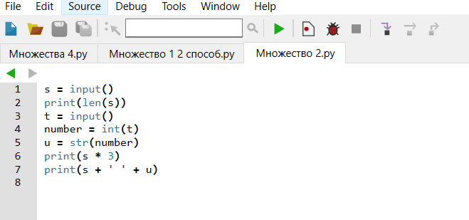 Cтроки Строка считывается со стандартного ввода функцией input(). Напомним, что для двух строк определена операция сложения (конкатенации), также определена операция умножения строки на число. Строка состоит из последовательности символов. Узнать количество символов (длину строки) можно при помощи функции len. Любой другой объект в Питоне можно перевести к строке, которая ему соответствует. Для этого нужно вызвать функцию str(), передав ей в качестве параметра объект, переводимый в строку. На самом деле каждая строка, с точки зрения Питона, — это объект класса str. Чтобы получить по объекту другой объект другого класса, как-то ему соответствующий, можно использовать функцию приведения. Имя этой функции совпадает с именем класса, к которому мы приводим объект. (Для знатоков: эта функция — это конструктор объектов данного класса.) Пример1 : int — класс для целых чисел. Перевод строки в число осуществляется функцией int(). Срезы (slices) Срез (slice) — извлечение из данной строки одного