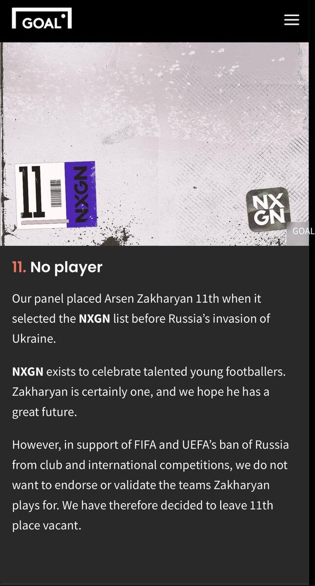 Сайт Goal.com включил Арсена Захаряна в топ-11 лучших молодых футболистов мира. Но, как уже стало всем нам привычно, в последний момент поменял решение и исключил игрока. Ну а под 11 номером теперь появилась надпись «нет игрока (правда, все же указав, что под этим номером планировалось присутствие Арсена Захаряна). При этом, ещё неделю назад представитель премии уверял сотрудников «Динамо», что несмотря на конфликт на Украине, Захарян будет в списке. Но, что-то пошло не так.