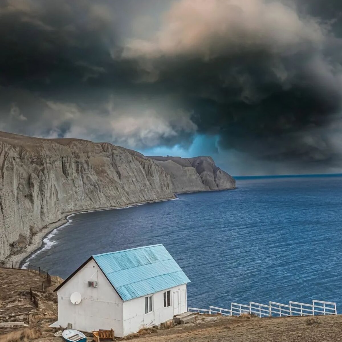 Кто уже про этот домик не писал. Но он по-своему уникален. Белоснежный инстадомик с голубой крышей, красивый заборчик у обрыва и синяя лодочка прекрасны только с одного ракурса.