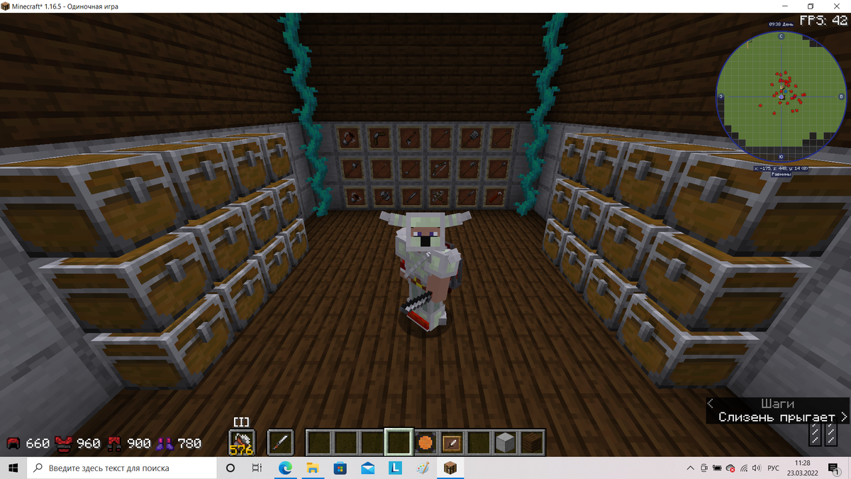 Проломило... А тут ещё пак оружия! Весело тут... Ладно начнём. Метательный нож. Мда... Неплохое оружие. Особенно когда остались рукоятки и оружкейные материалы. Кстати, классный прицел! Мне даже понравилось с ним бегать. Раз мне так понравилась данная оружка... Её броском и выберем следующие оружие. Кавалерийское копьё. С крафтом сложно, тут одна рукоятка и один шест. Считай 12 урона с лошадью. Круто! Размах кстати в режиме наездника, судя по всему, не работает. А ещё порадовало, что кататься можно и не на лошади. Неплохо. Динамитная шашка. Классическая взрывалка. Полезна, но затрат не стоит. Можно использовать что бы взрывать толпы туповатых врагов (как стражники замка из мода dungeonsmod). Тяжёлый арбалет. Тут в двух словах не рассказать... Но ведь одна (вообще-то три) картинка заменяет тысячу слов! Ну да, всё так. Придётся прицеливаться. Неплохой урон, неплохая точность. Длинный лук. Всё понятно. Более точный лук, хорошо. Колчаны. Можно улучшать. На колчане видна часть стрел. Мен