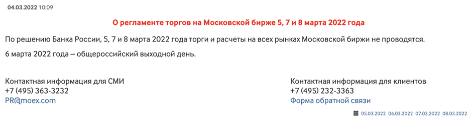 В случае повышенной волатильности и паники на рынках биржа может остановить торги. ММВБ останавливает торги при следующих условиях: 1) Если цена акции растет или падает на 20% и держится на этом уровне в течение 10 минут подряд. 2) Если в течение 10 минут индекс Московской биржи растет или падает на 15% до 16:40 мск, все торги акциями приостанавливаются на полчаса. В течение дня таких приостановок может быть только две. Если резкое изменение цены происходит в третий раз, торги на Московской бирже останавливаются до конца дня. Биржа может возобновить торги через несколько дней, когда паника инвесторов немного остынет. О приостановке и возобновлении торгов биржа сообщает на своем официальном сайте. Во время приостановки торгов биржа может ввести режим дискретных аукционов. Дискретный аукцион Дискретный аукцион (ДА) — это специальный режим торгов, который заменяет приостановку торгов. Дискретный аукцион проводится только по акциям, входящим в состав индекса Мосбиржи. В течение дня по одно