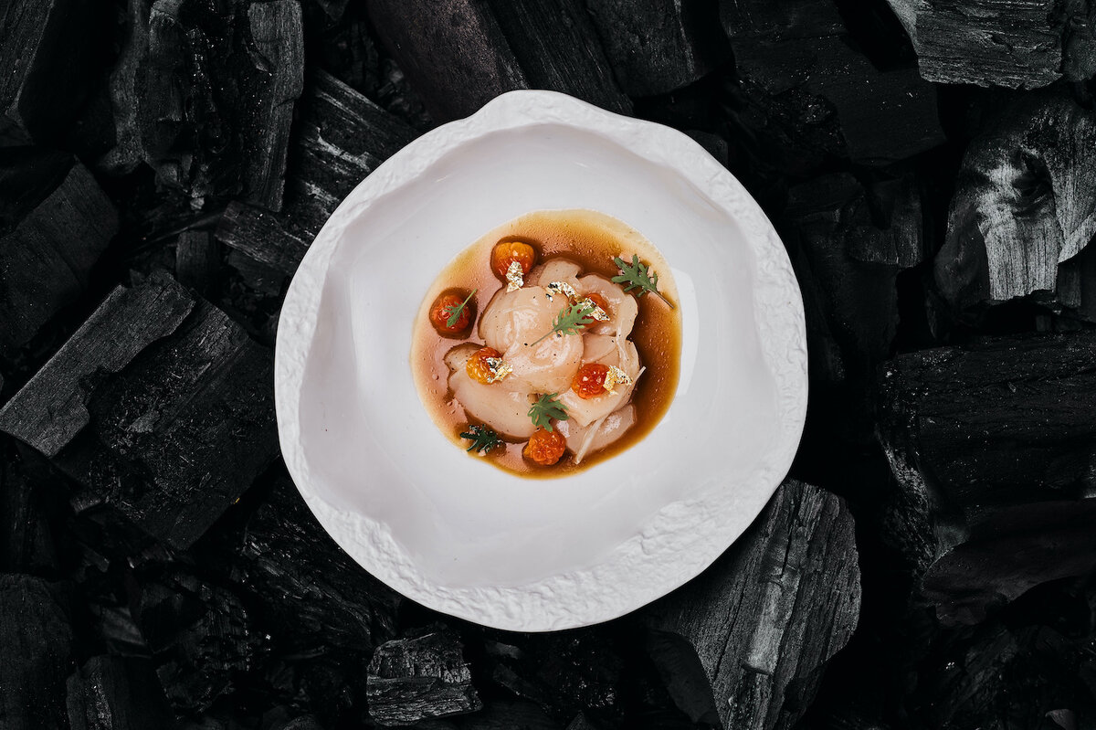 - Сугудай из охлажденного гребешка с таймырской морошкой и сусальным золотом;