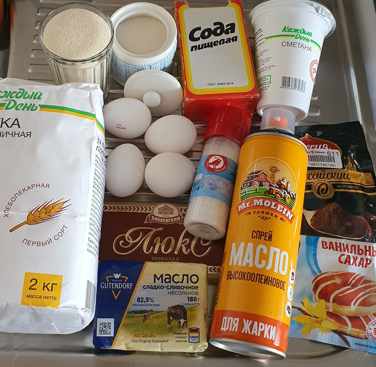 Этот кекс с кусочками шоколада, очень простой в приготовлении, но от этого не менее вкусный. По структуре очень нежный и влажный внутри, с тончайшей хрустящей корочкой снаружи и островками жидкого шоколада. Ингредиенты: - сметана 300 грамм - мука 1 стакан - крупа манная 1 стакан - сахар 1 стакан -яйцо куриное 4 штуки - масло сливочное 100 грамм - масло растительное 4 столовые ложки - какао-порошок 3 столовые ложки - соль 1 щепотка - сода 1 чайная ложка - ванильный сахар 10 грамм - шоколад 100 грамм Смешать манку со сметаной и оставить на 1 час. К сливочному маслу комнатной добавить сахар, соль, ванильный сахар. Тщательно взбить. Продолжая взбивать, добавлять по одному яйца. К манке со сметаной добавить соду и какао. Тщательно перемешать. Добавить растительное масло. Тщательно перемешать. Соединить манную смесь с яично-масляной. Добавить муку. Взбить миксером до однородного состояния. Плитку шоколада разломать на достаточно крупные кусочки. Форму для запекания (ди
