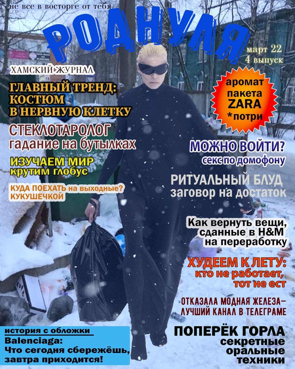 Салют, немодные! Продолжаю пока туточки вещать новинки мод. Чтобы не потеряться и видеть посты без опозданий, подписывайтесь на телеграм -канал "Отказала модная железа". Тама я ежедневно просвещаю, что нынче носють. 1. А начну я с четвертого выпуска дамского журнала "Роднуля". Модель на обложке одета традиционно в Balenciaga. 2. Ты будешь есть песок по которому я ходила. AVAVAV $1069 3. Непозволительная теперь для нас роскошь. Balenciaga $2290 (713 бутылок водки) 4. Между комбинезоном Maison Margiela за $2870 и забродами для рыбака за 3693₽ сотни километров концептуального ничего. 5. Не билась за тампоны — пустила дело на самотёк. Collina Strada $200 Для мужчин тоже есть 6. Тоскливая подделка и неповторимый оригинал. 7. Носить с собой запасной попец. Alexander Wang $595 8. Одежда не может быть пессимистом. Одежда: 9. Выглядеть нищим становится невыносимо дорого Maison Margiela $4195 10. Хорошего настроеньица вам! Burberry Искренне ваша Алла Корж. Предыдущие серии: 1 часть , 2 ча