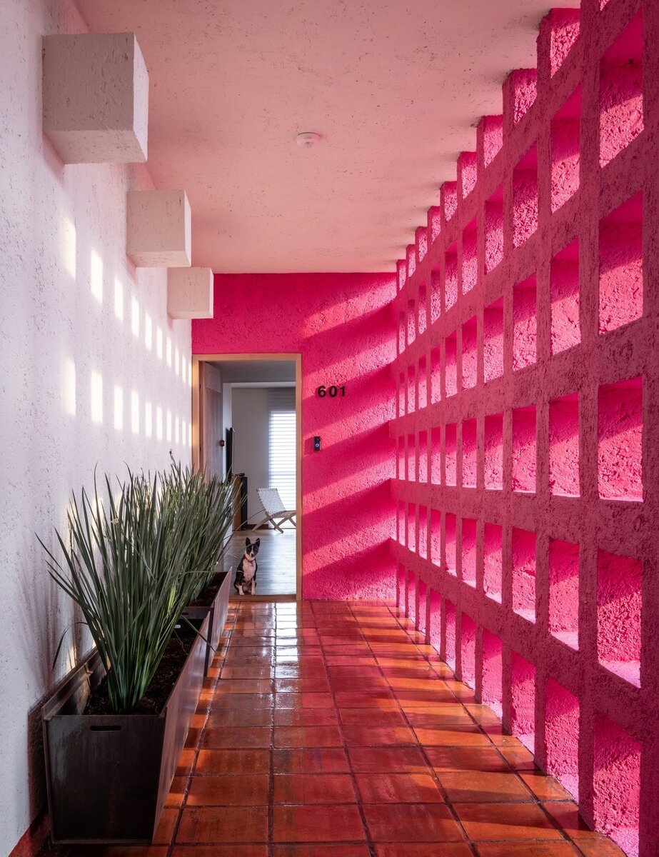 Мексиканская студия Estereotomia оформила квартиру в жилом высотном доме в Мехико, где нашлось место и для работы, и для отдыха, и для собаки Жилой комплекс Antigua был построен в районе Санта-Фе в Мехико известным мексиканским архитектором Рикардо Легоррета (Ricardo Legorreta) в 1990-е годы. Он стоит на зеленом холме и сразу привлекает к себе внимание, благодаря фасадам зданий цвета охры с ярко синими и розовыми вкраплениями и высотке цвета терракоты. Именно в ней и находится эта квартира, над интерьерами которой работал дизайнер Алехандро де ла Вега Сулуэта (Alejandro de la Vega Zulueta) из студии Estereotomia. Первое, что бросается в глаза, — это коридор цвета фуксии и с полом из керамической плитки перед входной дверью, который сразу настраивает на позитивный лад и как бы обещает «продолжение банкета» и буйство красок внутри квартиры. Но дизайнер решил отказаться от очевидных решений и сделал выбор в пользу сдержанного, лаконичного скандинавского стиля — возможно менее эффектного,