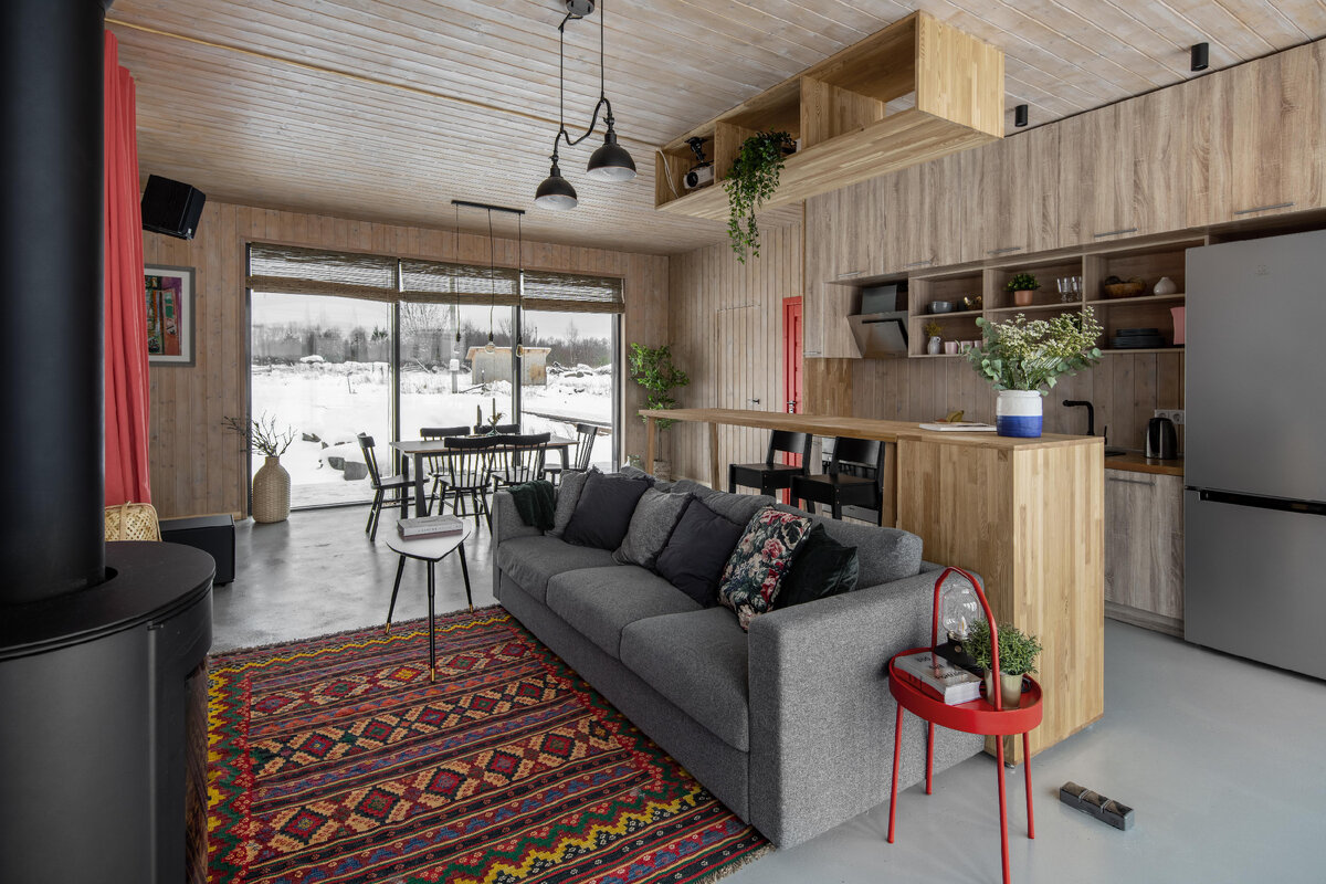 Вдохновившись деревянной архитектурой и дизайном cкандинавских стран, дизайнер Майя Баклан создала комфортный и лаконичный гостевой дом на берегу Онежского озера Заказчики проекта, братья-предприниматели Игорь и Сергей, хотели построить современный гостевой дом, который бы не был похож на окрестные жилища, но в тоже время вписывался в местный ландшафт. «Архитектура карельской деревни Кажма узнаваема и однородна: по большей части это типичные лесные избушки. Отец заказчиков был родом отсюда, поэтому Игорь проводил здесь каждое лето. Жить приходилось в палатке — самое богемное решение на фоне отсутствия премиального жилья. Так родилась идея построить гостевой дом для взыскательных постояльцев, который стал бы самодостаточным назначением — местом, куда хочется возвращаться вновь», — рассказывает дизайнер Майя Баклан. «Изначально основой проекта должны были стать три стандартных 40-футовых морских контейнера, которые можно объединить в большой дом. Однако оказалось, что такое решение предп