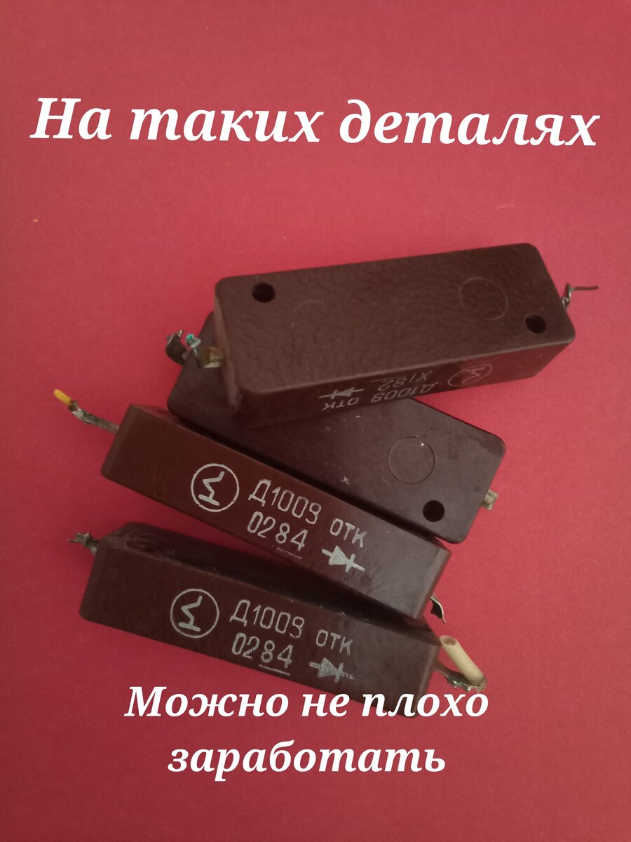 Всем здравствуйте! Хочу рассказать сегодня о различных видах диодов. Вообще существует огромное количество разновидностей этих радиодеталей. Но не во всех же этих диодах, содержится золото. Я не буду расписывать какие они бывают, и все их разновидности. Но конечно во многих из них содержится золото, ведь они все советского производства, а в то время на такую промышленность драгоценных металлов не жалели. Стремились к долговечности и качеству своего продукта. На фото приведен один из примеров Диода. Именно такой, Д1009,такой маркировки, приемный и стоит не плохих денег от100 рублей и выше за один такой диод. И они к стати часто попадаются , по крайне мере я такие находил и нахожу частенько. Вот еще мой пример светодиода https://zen.yandex.ru/media/id/62270773e4c16e4f27f7aa6b/i-tut-ia-nashel-zoloto-62283758ebcfe722ac391573 , которые тоже приемные. Такой пример, красивых оранжевых диодов, в том числе и коричневые маркировки КЦ405а. Они тоже с содержанием золота, и разновидность таких о
