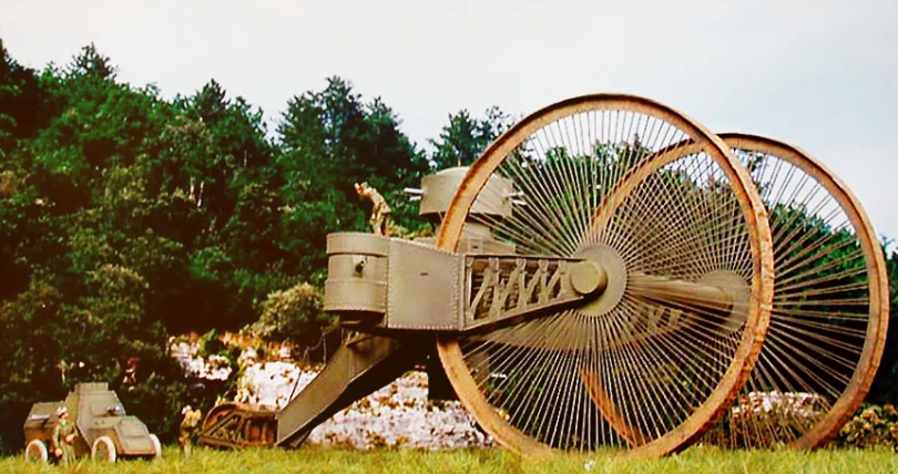 На высоченных колесах устанавливалась стальная рубка, внутри которой находился пулемет. Высота, на которой он располагался, равнялась восьми метрам, что позволяло пулеметчику видеть противника в действительно большом радиусе.