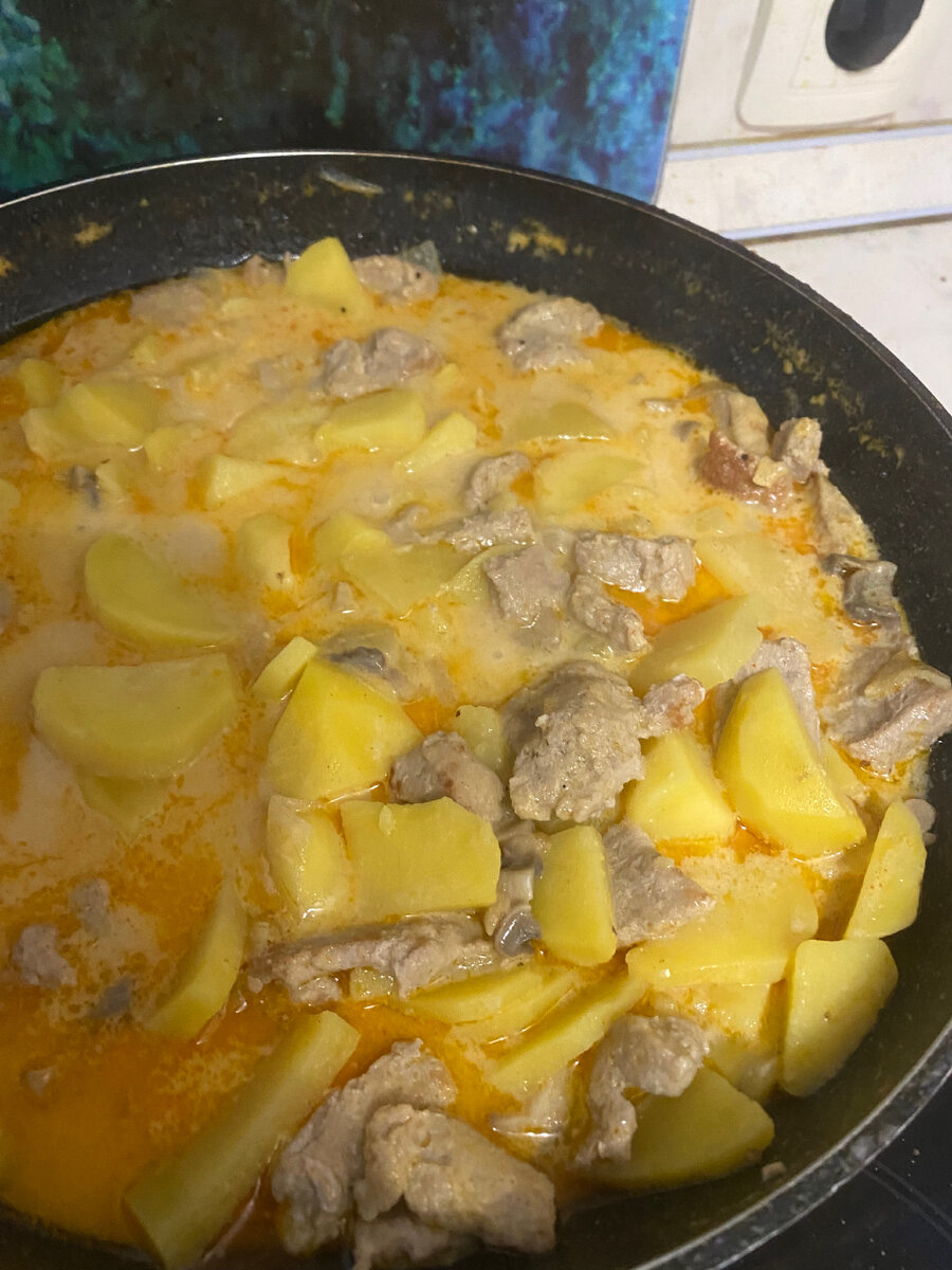 всем привет , вы на канале «Правильная жизнь» советую подписаться , ведь я все чаще делаю здесь что-то новое прижимом интересное а сегодня я покажу вам рецептик который попробовал на днях , сам накидал туда всего вкусненького - и вышло что-то вкусное ) нарезаем лук , я не режу лук красиво как некоторые , как нарезал - так и надрезал - главное вкус! пока режем лук нагреваем сковородку 5 минут , потом кидаем лук в сковородку и жарим до золотистой корочки Наризаем либо куриное филе , либо куриные котлетки как я - такими кусочками жарим на среднем огне около 10 минут нарезаем картошки жарим на среднем огне около 15 минут наливаем тёплой либо горячей воды , перчим , и солим и делаем соус из Сметаны и корицы а также специй по вкусу Перемешиваем , и еще 20 минут подогрева