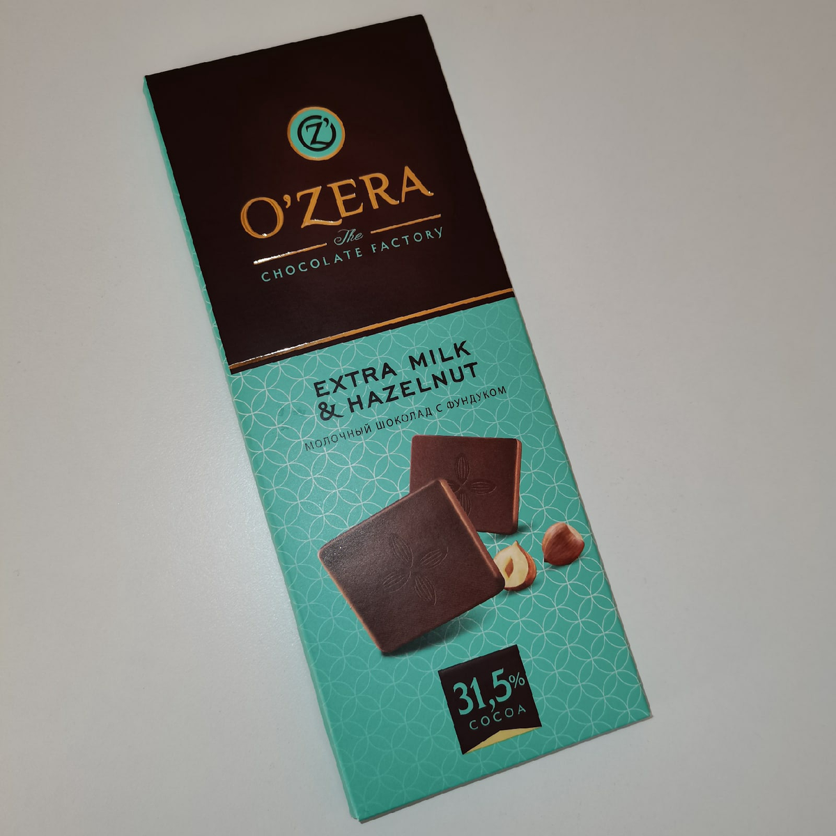 Плитка в очень красивой и большой картонке, по размерам побольше, чем обычная плитка от Альпен Гольд или Милки, но по весу имеет те же 90г. Это всё оттого, что плитка тоньше и квадратики как маленькие печати прижаты прессом. Шоколадка, кстати российского производства. С обратной стороны видны кусочки дроблёного фундука. Цвет шоколада светло-коричневый, как у самых молочных плиток. Плитки большие и тонкие, на каждой из них - цветочки из какао-бобов, запах молочно-ореховый, чем-то похож на нутеллу. Вкус нежный, шоколадка тает на языке, похоже на нутеллу или Алёнку в её лучшие времена. Сейчас многие недорогие шоколадки стали совсем невкусные, какие-то маслянистые и даже в руках не тают, а сладкие до того, что за ушами сводит (да, я про Алёнку и Альпен Гольд), если вам хочется шоколада "как раньше", то шоколадки O'zera вполне подойдут на эту роль. единственный недостаток: сложно найти в сетевых магазинах, в Магните и Пятерочке ни разу не видела, встречала либо в маленьких локальных магази