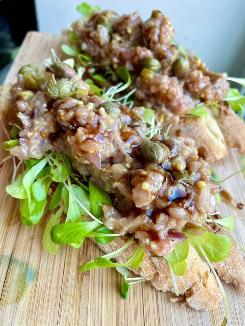 Брускетта с тартаром из телятины вряд ли подойдёт для завтрака 😉, но прекрасно разнообразит ужин или праздничный стол👍🏻. Тартар нужно приготовить заранее, чтоб мясо немного промариновалось огурцами и луком. Ингредиенты: Багет, Телятина (я беру Мираторг) , Маринованные огурцы, Красная луковица, Желток, Соль, перец, Каперсы, Микрозелень салата (или просто листья салата), Горчица (не острая) Способ приготовления: Ломтики багета поджарить в тостере. Готовим тартар. Телятину измельчаем блендером или нарезаем мелко. Огурец и лук рубим на мелкие кубики. Смешиваем мясо с огурцами и луком. Солим. Перчим. Добавляем горчицу ещё раз все хорошо перемешиваем. Убираем в холодильник мариноваться. Я обычно на час убираю. Собираем брускетту. На ломтики багета выкладываем микрозелень салата (или обычные листья салата). В тартар добавляем сырой желток, перемешиваем и выкладываем его на багет. Добавляем каперсы. Готово! Приятного аппетита! ☝🏻 По желанию можно багет натереть чесноком.