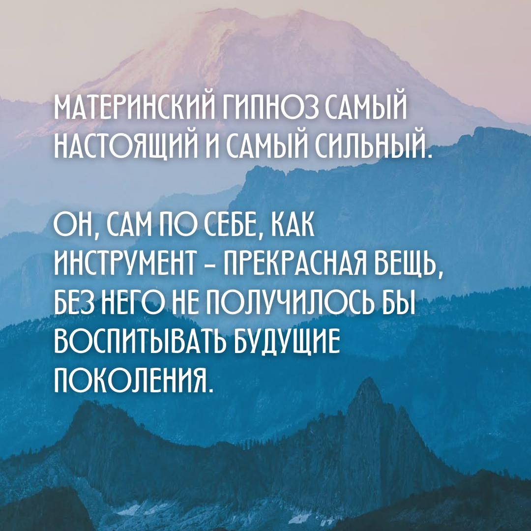 Забудьте о том значении слова гипноз, о котором вы знаете. Это не маятник перед глазами, не транс, не звуки. Но когда у психически нездоровой матери рождается ребенок - этот гипноз становится разрушительным, убийственным. Стоит обозначить пару моментов. Эта связь есть у всех в семье, в каждой связке: мама - дочь, мама - сын, папа - дочь, папа - сын. Но самая сильная это мама - дочь. Научно доказана телепатическая чувствительная связь именно мамы с дочкой, поэтому я так много уделяю внимание этому союзу. Но это не значит, что мальчики меньше страдают. И это не значит, что нет гипноза папа - дочь или папа - сын. Так что, смело заменяйте в моих словах маму на папу. Признаки материнского гипноза. Эти признаки означают, что вы под гипнозом! Ни один человек в здравом уме не будет спорить и ругаться, доказывать что-то постоянно одному человеку на протяжении всей своей жизни! Так а почему мы это делаем тогда с мамой? Или с папой? Почему? Всю жизнь… Может вам сразу придет в голову детст