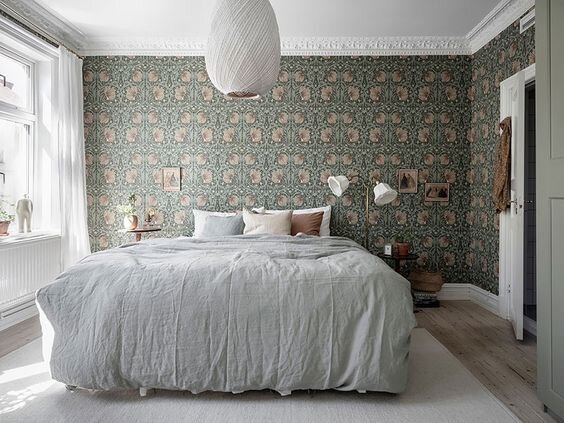 Обои с благородными принтами в качестве акцента на стене.