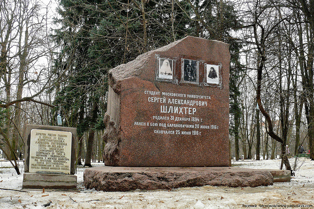 «Студент Московского университета Сергей Александрович Шлихтер родился 31 декабря 1894 г. ранен в бою под Барановичами 20 июня 1916 г. скончался 25 июня 1916 г.»