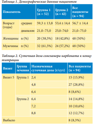 Исследование продолжалось с июля 2020 г. до декабря 2021 г. В исследование были включены 94 пациента с ХБП, находящихся на гемодиализе, из которых у 52 больных (первая группа) уровень фосфора был 1,78–2,42 ммоль/л, у 42 больных (вторая группа) уровень фосфора был выше 2,42 ммоль/л. При включении в исследование средний уровень фосфора составил 2,43 ± 0,65 ммоль/л, средний возраст – 56,7 ± 14,4 года. Демографические данные представлены в табл. 1. В соответствии с протоколом исследования 52 (55,3%) пациента изначально получали лечение севеламера карбонатом в дозе 2,4 г/сут и 42 (44,7%) пациента получали севеламера карбонат в дозе 4,8 г/сут. В первой группе на визите 3 34 (65,47%) пациента продолжили прием исследуемого препарата в суточной дозе 2,4 г, 18 (24,0%) пациентам потребовалось увеличение суточной дозы до 4,8 г. Во второй группе суточная доза севеламера карбоната у 21 пациента осталась прежней – 4,8 г/сут, а 21 пациенту пришлось увеличить дозу до 7,2 г/сут. В первой группе на визите 4 15 (28,9%) больных продолжили прием севеламера карбоната в дозе 2,4 г/сут, 27 (51,9%) больных получали севеламера карбонат в дозе 4,8 г/сут, 8 (14,8%) больных – в дозе 6,4 г/сут. Во второй группе на визите 4 у 14 пациентов доза севеламера карбоната составила 6,4 г/сут, у 11 пациентов – 7,2 г/сут, еще у 11 пациентов – 8,8 г/сут. На визите 5 изменения дозировки севеламера ната не потребовалось, больные продолжили прием в той же дозе (табл. 2). Таким образом, минимальное количество Селамерекса – 2,4 г/сут (три таблетки) – принимали только 15 из 94 (15,9%) пациентов, у остальных пациентов доза Селамерекса была выше и в среднем составила 5,6 ± 1,98 г/сут. Динамика изменений уровня фосфора за время исследования представлена в табл. 3. У всех больных наблюдалось достоверное снижение уровня сывороточного фосфора. Целевой уровень сывороточного фосфора ≥ 1,13 и ≤ 1,78 ммоль/л к концу лечения был достигнут у 75 (87,2%) пациентов. У 11 (12,7%) пациентов, не достигших целевого уровня фосфора, средний уровень фосфора к концу исследования составил 1,85 ± 0,23 ммоль/л. К концу исследования в обеих группах статистически значимо снизился уровень скорр.Са с 2,27 ± 0,12 до 2,04 ± 0,11 ммоль/л (р < 0,001), уровень ПТГ не изменился.