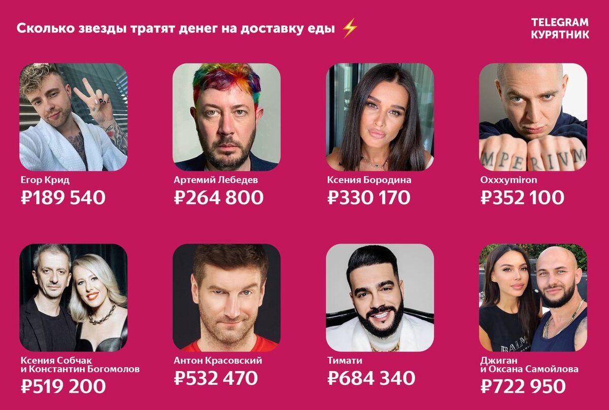 ТК «Курятник» проштудировал гуляющую по соцсетям базу: Сколько звезды тратят денег на доставку еды ⚡️ «В сеть утекла вся база Яндекс.Еды. По ссылке видно ФИО, телефон, адрес и сумму потраченную за 6 месяцев. Мы решили посмотреть, сколько потратили знаменитости за последние полгода 👇 Рейтинг открывает Егор Крид. Певец не часто пользуется доставкой Яндекс, общая сумма его заказов составляет ₽189 тысяч. Артемий Лебедев «наел» на ₽264 тысячи и все заказы – на один адрес. Следом идет Ксения Бородина, курьеры привезли телеведущей в посёлок «Павловские озёра» блюда из ресторанов на ₽330 тысяч. Оксимирон, живущий в районе Большой Никитской, потратил ₽352 тысячи. Ксения Собчак и Константин Богомолов вместе заказали у Яндекс на ₽519 тысячи, а пропагандист Красовский за полгода потратил на еду ₽530 тысяч (вспоминается видео, где он не понимает, почему россияне скупают макарошки). Крайне интересные заказы у Тимати, мы насчитали 8 адресов доставки на общую сумму ₽684 тысячи. Рекордсменом стала С
