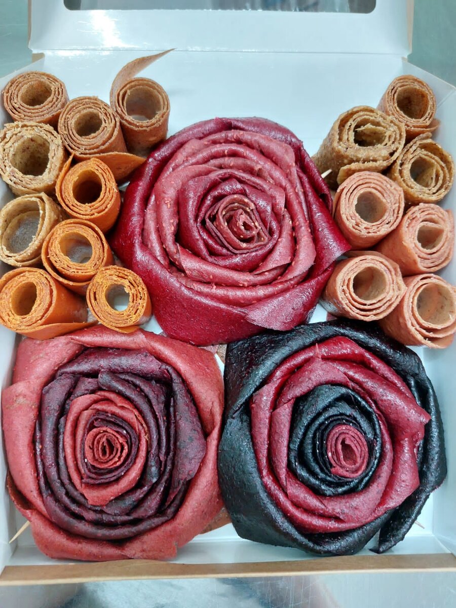 Какой вкус у моих роз? А какой скажете, такой и будет. Да, я складываю розы из рулончиков пастилы любых вкусов, которые произвожу. Как я дошла до съедобных роз, спросите вы? Спасибо его Величеству Случаю и моей Фантазии) Идея возникла совершенно спонтанно. Просто сидела вечером на кухне. Ну ладно, не просто, а креативила. Поскольку процесс творчества не прерывается у меня никогда, то размышляла, как бы красиво уложить в коробочку пастилу. В голове мелькнуло про цветочки. Взгляд упал на кухонные ножницы. Потом на лист пастилы. А дальше отпустила воображение, и понеслось… Разрезала свиток пастилы, стала скручивать-складывать. Почти мгновенно появившаяся на свет маленькая розочка была милая и симпатичная. Особых творческих мук при рождении новой “звездочки” и не было. Легко родилась и легко пошла по жизни вместе с другими пастильными сестрами и братьями) Розы складываю и сегодня по принципу оригами. Если кто не знаком с этой технологией напоминаю: искусство оригами это создание пр