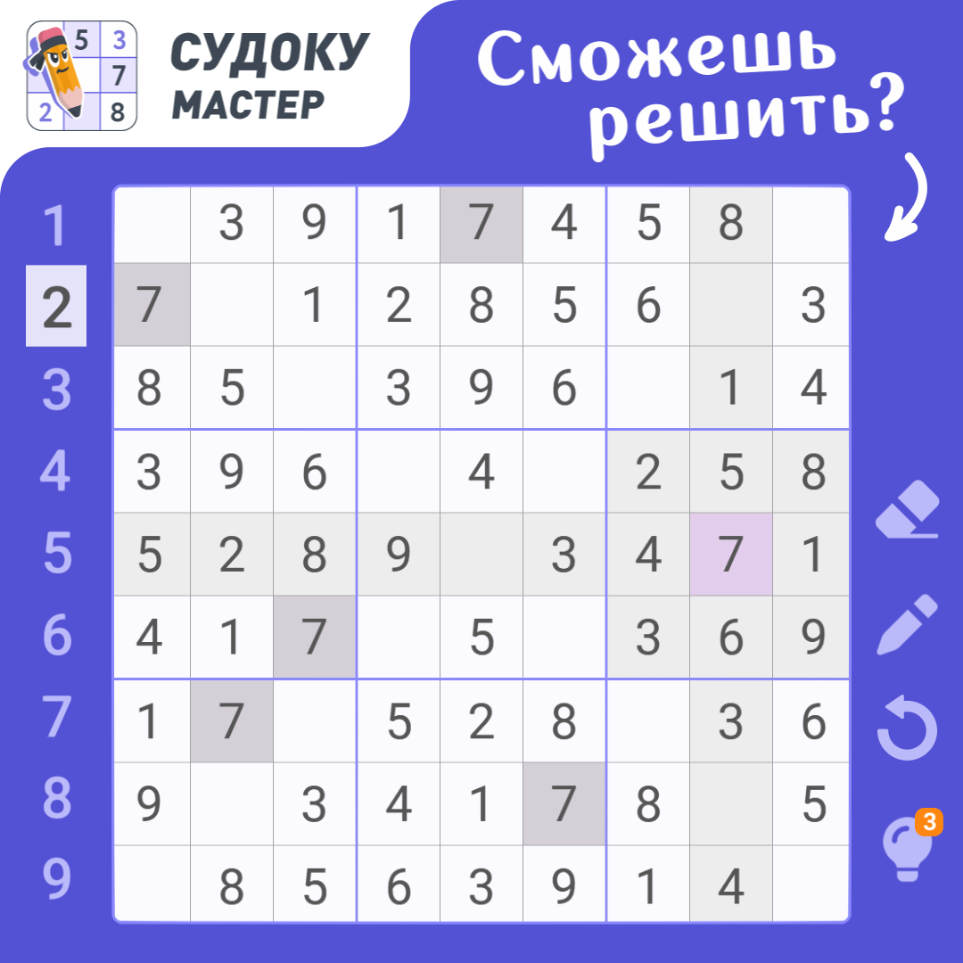 Сегодня вновь приступим к решению задач ведь чтобы стать настоящим мастером Судоку, нужно много тренироваться и рано или поздно все обязательно получится! Так что заполняйте игровое окно и практикуйтесь каждый день вместе с нашим каналом!