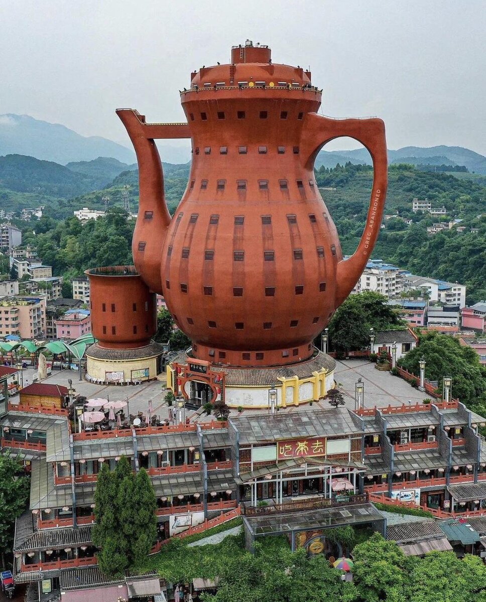 Вот честно, я уже подготовил статью про крутой американский ар-деко, но пройти мимо такого я не смог. Да, это дом-чайник, причём даже с чашечкой, это вам не главный офис банка "Санкт-Петербург", который лишь отдалённо напоминает чайник. Это просто отель в форме чайника. Естественно, все это дело построено в Китае, с одной в этой стране, действительно, чай - важная составляющая жизни, а с другой любят там всякий архитектурный треш. И да, это отель, так как нет никакой адекватной причины купить в таком доме квартиру, а для социального жилья можно построить и что-то по-проще. И всё-бы ничего, если бы это был один такой дом-чайник. В том же Китае, посмотрев на отель, кто-то сказал, что эта форма чайника для нас не традиционна, вообще в Европе так и кофе пьют, так что надо построить что-то традиционной формы и посовременнее. Партия сказала надо, комсомол ответил есть, и был построен культурный центр в виде типичного китайского чайника. Насколько я понимаю, там как раз детям рассказыва