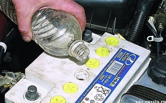 1) Сперва оденьте на руки перчатки, так как в аккумуляторе находится кислота, которая при попадании на кожу может вызвать травмы. 2) Далее чистой, или же немного загрязненной небольшой тряпкой, очистите всю поверхность аккумулятора от грязи, для того что бы при выворачивании пробок, в аккумуляторные отсеки не попадала различного рода грязь. 3) Следом проверьте насколько хорошо сидит аккумулятор на своем месте, если аккумулятор болтается, то в таком случае примите все меры по устранению этой проблемы. 4) Затем проверьте хорошо ли сидят клемы на аккумуляторе, плохо затянутые клемы могут так же привести к отказам электрооборудования в машине. Заливание дистиллированной воды в аккумулятор 1) Сперва при помощи пяти рублевой монеты, или же толстой отвертки, выверните абсолютно все пробки, которые закрывают отсеки аккумулятора. 2) И после чего проверьте уровень дистиллированной воды, в каждом отсеке аккумулятора, но если же уровень в каком либо отсеке аккумулятора слишком мал, то в таком слу