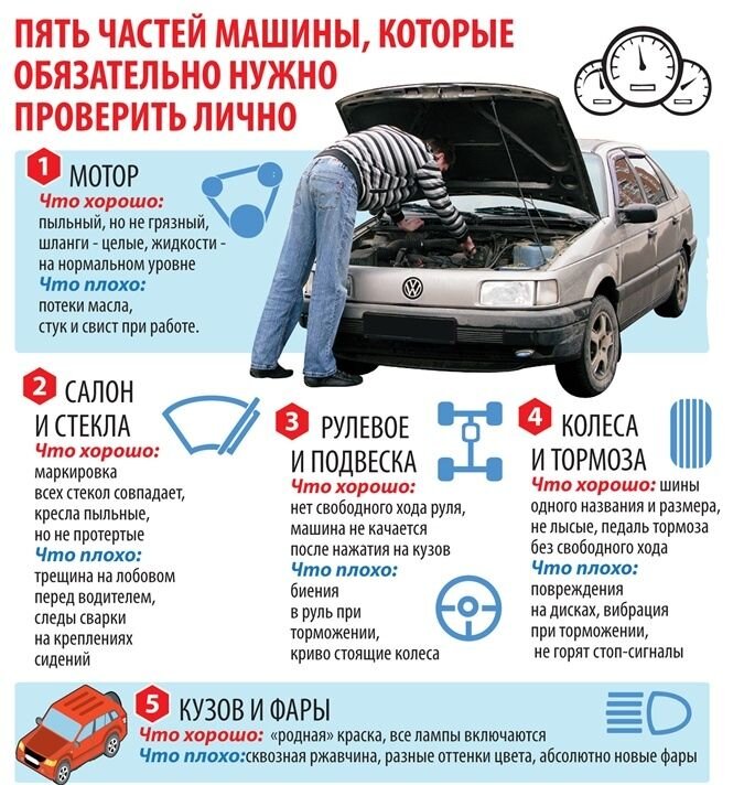 Что проверять при покупке авто. Конечно, при покупке автомобиля проще загнать его на сто, где вам подробно, или нет, расскажут о нюансах данного авто. Однако личный осмотр также не будет лишним, даже если вы в этом совсем не разбираетесь. На картинке описаны самые основные места, куда нужно заглянуть при покупке авто.