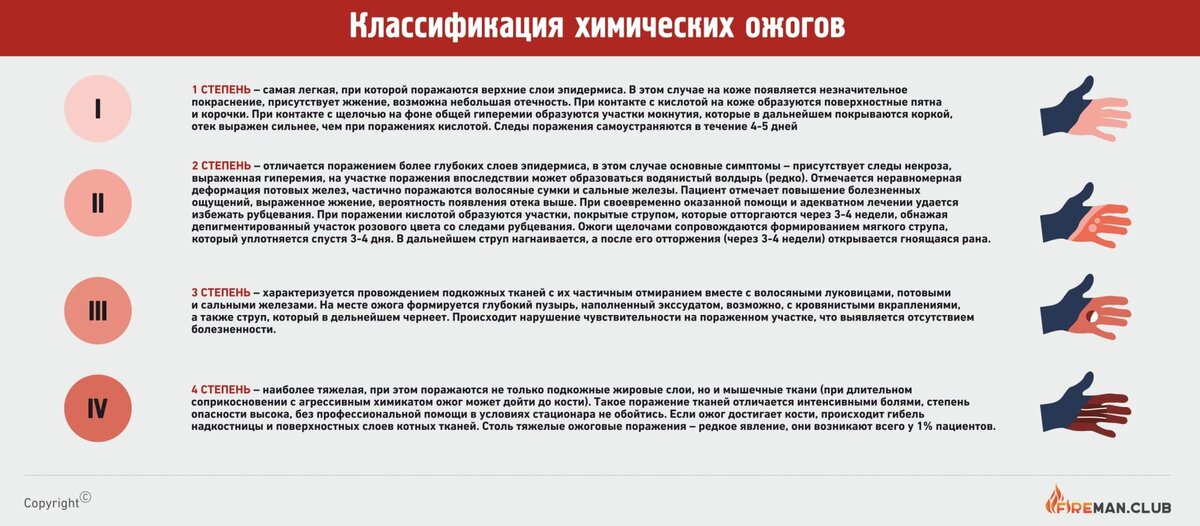 Если говорить о классификации химических ожогов, их разделяют по степени тяжести: