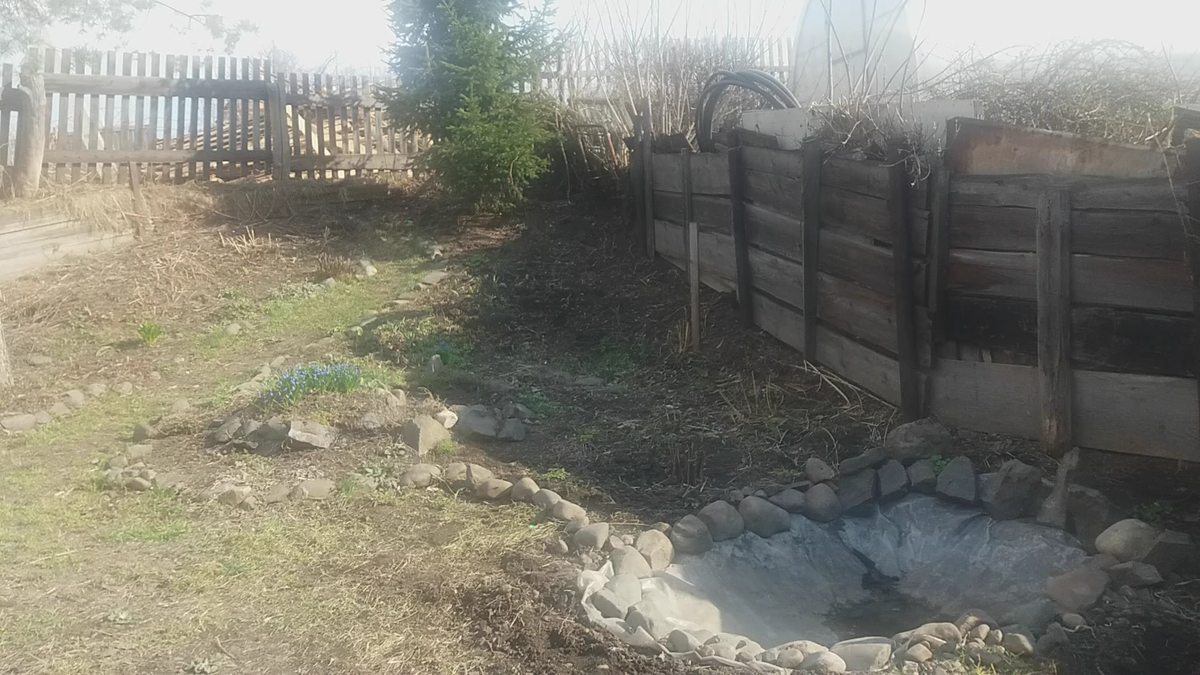У моих соседей вот такой забор, все ветки сверху, это клен, скоро он зазеленеет и моим цветочкам тут будет очень темно. Я часто обрываю зеленую поросль, но она еще быстрее нарастает. Поэтому я пробую закрыть забор со свой стороны высокорослыми растениями. Давайте рассмотрим клумбу весной сезон 2021г.. Вдоль дорожки, я сажала маргаритки и примулы, буду подсаживать ещё в этом году, так как маргаритка со временем пропадает, а примул сажала всего 3шт. Так же на этом ряду произрастают седумы карамелька и самосевом всходит незабудка, которую после цветения я убираю. В следующем ряду у ели растет люпин, манжетка, гейхера и лапчатка, между ними я осенью сажала тюльпаны. Центр этой клубы я отдам можжевельнику кавказскому, он еще очень маленький, высажу чуть позже как раз за одиночным тюльпанчиком, поэтому пока тут будут однолетние цветы, а чуть выше у елки я высадила плетистую розу, надеюсь она примется, нарастет и закроет хоть часть забора, в этом году закрывать забор будет золотарник. Хоста