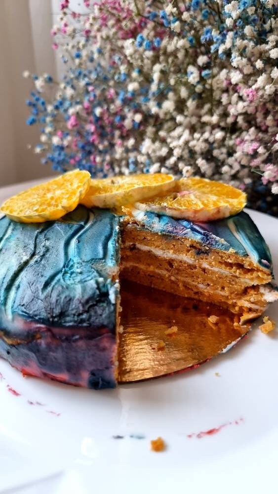 Ингредиенты: яйца, морковки (средние), разрыхлителя, кефира, яблока (маленькие), муки (у меня кукурузная), грецкий орех, Крем : крем чиз (сверху для выравнивания), сливки, рикотты (можно больше и тогда хватит промазать коржи), Подсластитель, Крем для промазывания коржей внутри, мягкий творог, йогурт греческий или просто без вкуса, Подсластитель Способ приготовления: Коржи: морковь и яблока в блендере измельчить. Добавить все остальное. Разлить на коврик для выпечки и в духовку на 20 мин. Достать остудить и разрезать на нужные формы. Крем- чиз готовим из ХОРОШО ОХЛАЖДЕННЫХ ПРОДУКТОВ Рикотту с подсластителем в блендере до однородности, добавить сливки и взбивать до загустения крема. Поставить в холодильник на 20 мин. 2-й крем : все смешать и промазать коржи. Крем-чизом обмазать торт сверху.