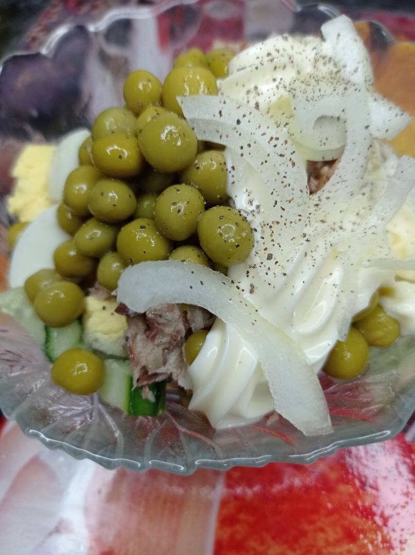 Какими разнообразными могут быть салаты с рыбными консервами. Ведь консервы из рыбы отлично сочетаются с яйцом, овощами . Салаты из рыбных консервов можно подавать даже на праздничный стол. Какие ваши любимые салаты из консервы? Ингредиенты: Яйцо вареное, Картошка, Огурец, Лук красный, Консерва с рыбой, горошка, Соус горчица + майонез, Специи Способ приготовления: Нарезать все кубиком (размер кубика по вашему вкусу). Консерву помять и добавить на овощи. Лук красный полу кольцами, отлично сочетается по цвету и вкусу в этом салате. Соус можно использовать просто майонез, а можно горчица - майонез. Добавить горошек и специи, перемешать. Этот салат прекрасно подходит на праздничный стол как слоёный салат. Приятного аппетита 🥰 Всех обнимаю 🙌