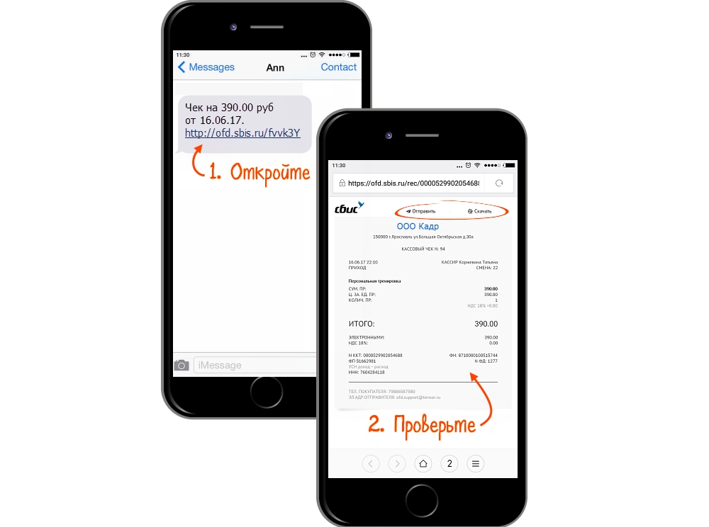 В смс покупатель увидит сумму чека, дату покупки и ссылку на электронную версию чека. Ее можно сохранить в формате *.pdf или отправить на email.