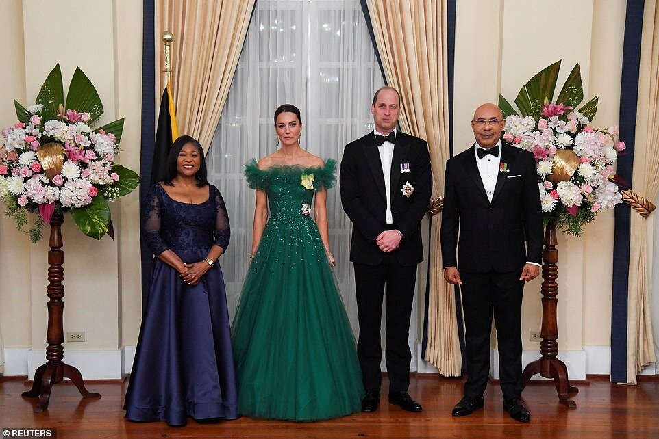 По случаю визита герцогов Кембриджских губернатор Ямайки устроил роскошный прием. Так завершился пятый день королевского карибского тура. Прием состоялся в Королевском доме, резиденции губернатора в Кингстоне. И журналисты уже провели параллели с визитом на Ямайку Королевы и герцога Эдинбургского, который состоялся в 1953 году. Это было самое гламурное событие за пять дней карибского тура. Герцогиня Кембриджская выглядела роскошно. На ней были серьги Королевы. Это коллекция Her Majesty the Queen's Emerald Tassel Parure, состоящая из набора серег, ожерелья, браслета и кольца. Герцогиня Кембриджская носила только серьги и браслет. А также она носила Орден Королевской семьи и рыцарскую звезду. Платье от британского дизайнера Дженни Пэкхем было великолепно. Во время банкета принц Уильям произнес довольно эмоциональную речь. во время которой сказал, что они с женой были очень рады своему первому официальному визиту на Ямайку, добавив: Уже за то короткое время, что мы здесь, Кэтрин и я рад