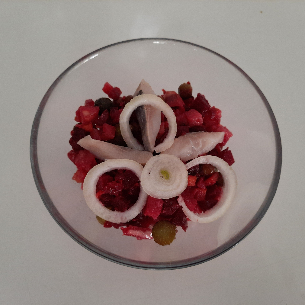 #готую Ингредиенты: буряка, моркви, картоплі, цибулі, маленьких консервованих огірочків, Олія для заправки, консервованого горошку, Сіль , слабосоленої риби для прикрашання Способ приготовления: Овочі миємо та поміщаємо в рукав (краще готувати всі овочі окремо). Запікаємо в духовці при температурі 180 градусів до готовності (тривалість залежить від духовки). Охолоджуємо та очищаємо. Нарізаємо невеликими кубиками. Цибулю чистимо та подрібнюємо, заливаємо окропом на 10 хвилин. Нарізаємо огірки кружечками. Всі овочі поєднуємо, перемішуємо та заправляємо спеціями та олією. Можна прикрасити слабосоленою рибою та кільцями цибулі. Смачного!