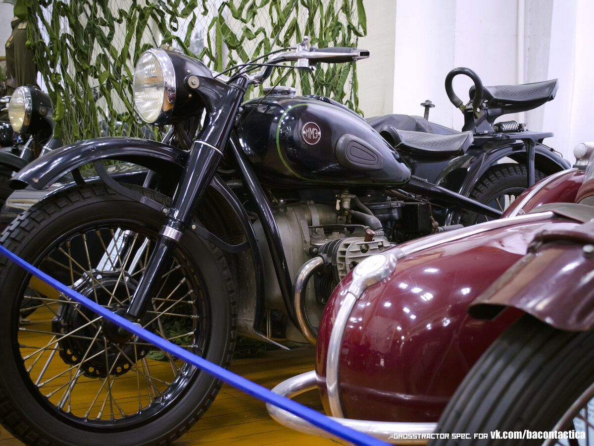 Обратите внимание — музейный экземпляр из раннего выпуска, имеет цилиндры, отлитые из алюминиевого сплава, с общим туннелем для штанг толкателей как у Zundapp КS750. Выглядит очень стильно и законченно. Далее завод стал комплектовать двигатели цилиндрами со стальными трубками штанг толкателей (как на "Уралах"), что, конечно, проще в производстве, но не так кошерно.