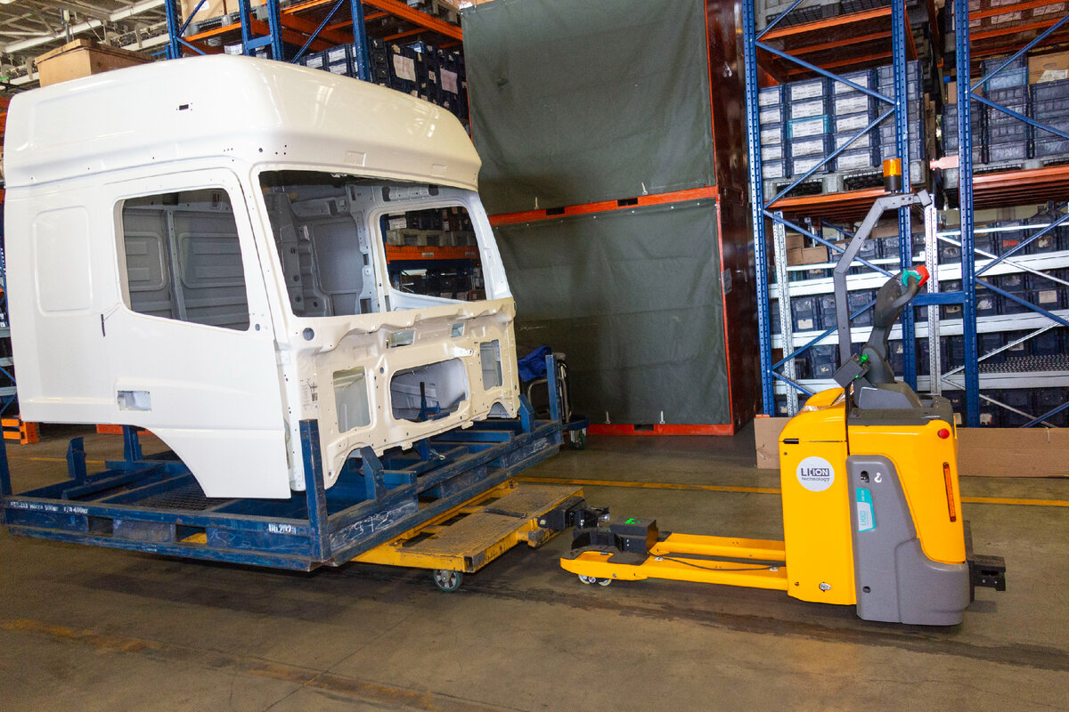 Сейчас работа погрузчиков осталась в небольшой зоне, где снимается порожний скид с тележки и устанавливается каркас кабины со скидом на тележку. На конвейер они теперь не ездят, что дополнительно повышает безопасность работ.