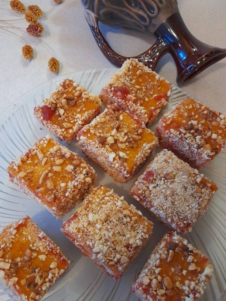 Захотелось немного переделать известное Школьное пирожное Ингредиенты: Мука, Маргарин, Сахар, Яйцо крупное или 2 мелких, Ванильный сахар, соль, Разрыхлитель, Повидло густое, Орехи, любые, Топинг (у меня Карамель) Способ приготовления: Масло смешать с сахаром, солью добавить яйцо, хорошо перемешать. В масляную смесь всыпать муку и разрыхлитель, замесить тесто. Тесто убрать в холод на 10- 15 мин. Далее выложить на пергамент (на котором будем печь, так удобнее) посыпанный мукой. Скалкой придать тесту форму прямоугольника, высотой 5 мм. Выпекаем при Т 200 °С, 15 мин. Корж остужаем. У готового коржа срезаем края выравнивая корж. Срезанные края измельчаем. Орешки подсушиваем и измельчаем. Корж режем пополам и на 1 часть наносим повидло, можно прибавить любимый топинг и посыпаем орешками. Укладываем один корж поверх другого, на верх коржей наносим топинг, нарезаем полуфабрикат на квадратные пирожные. Вокруг пирожных наносим немного джема и прикрепляем измельченную крошку, удобно это делать ле