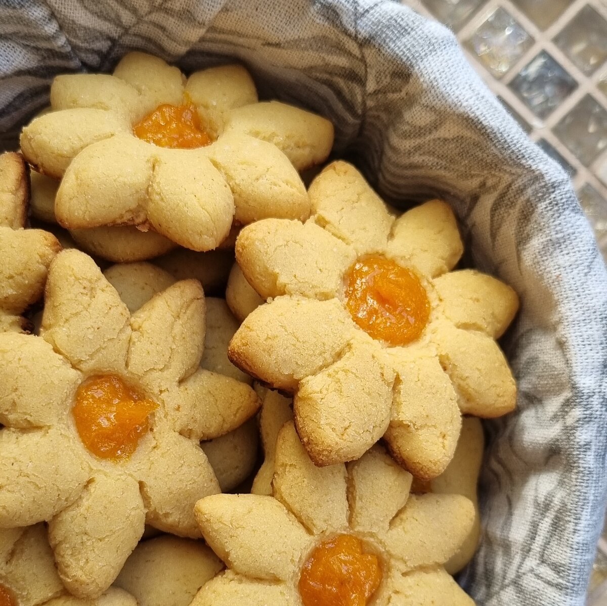 Калорийность 238 /100 г Б/Ж/У: 8/8/38 ИНГРЕДИЕНТЫ: Яйцо – 1 шт. Масло сливочное – 30 г Мука рисовая – 80 г Мука кукурузная – 55 г Мука нутовая – 50 г Мука ц/з пшеничная – 30 г Разрыхлитель – 7 г Мёд – 45 г Эритритол – 50 г Мягкий творожок – 100 г Щепотка соли. Для сердцевинок – курага, вода, пектин. Граммы не озвучиваю, потому что требуется совсем чуть-чуть, а я варила 100 г кураги. Соответственно лишней начинки остается очень много. ПРИГОТОВЛЕНИЕ: 8. В сердцевинки выдавливаем джем, мне помог кулинарный мешок. 9. Отправляем в духовку на 10-15 минут при 200 градусах. Зовём гостей на чай с печеньками! Приятного аппетита!