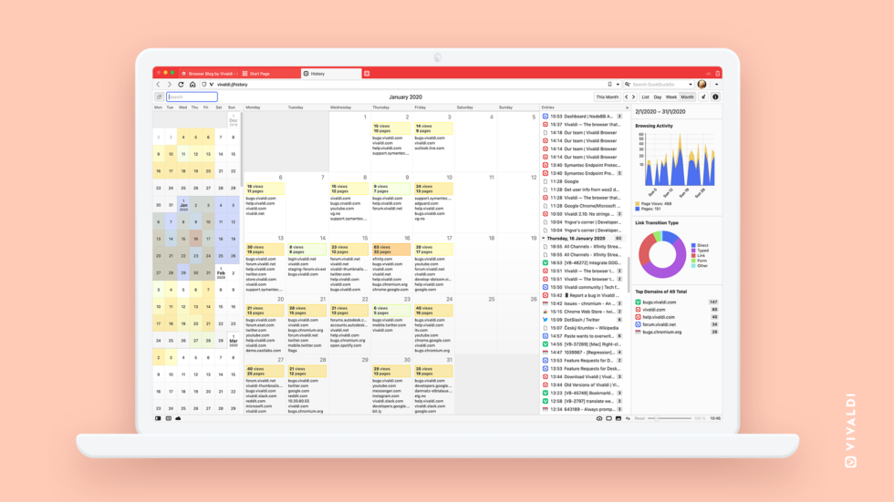 «История» в Vivaldi — это подробный обзор, подкрепленный статистикой и представленный в красивой, наглядной форме. Она была создана, чтобы дать нам мощный инструмент для изучения шаблонов просмотра и облегчить поиск ранее посещенных сайтов.