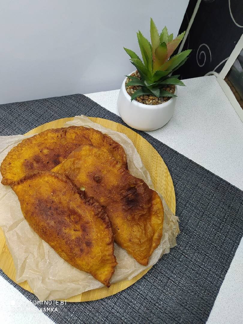 я вам рецепт, а вы мне ❤ Ингредиенты: тесто: , Кипяток , Соль , Мука , Яйцо , Растительное масло , начинка: , Фарш (свинина+говядина) , Лук , Соль, перец, специи, зелень Способ приготовления: Муку просеять и залить кипятком. Перемешать. Оставить на 1-2 мин. Добавить остальные ингредиенты и замесить тесто. Готовое тесто оставить на 30 мин. при комнатной температуре. Лук нарезать кубиками или пробить через блендер. Смешать с фаршем, специями и зеленью. Тесто делим на равные кусочки. Каждый раскатываем в круг и на один край выкладываем начинку. Накрываем вторым краем и защипываем. Прижимаем края вилочкой для красивого узора🙂. Жарим в разогретом масле с 2-х сторон до готовности. ПРИЯТНОГО АППЕТИТА🤤!